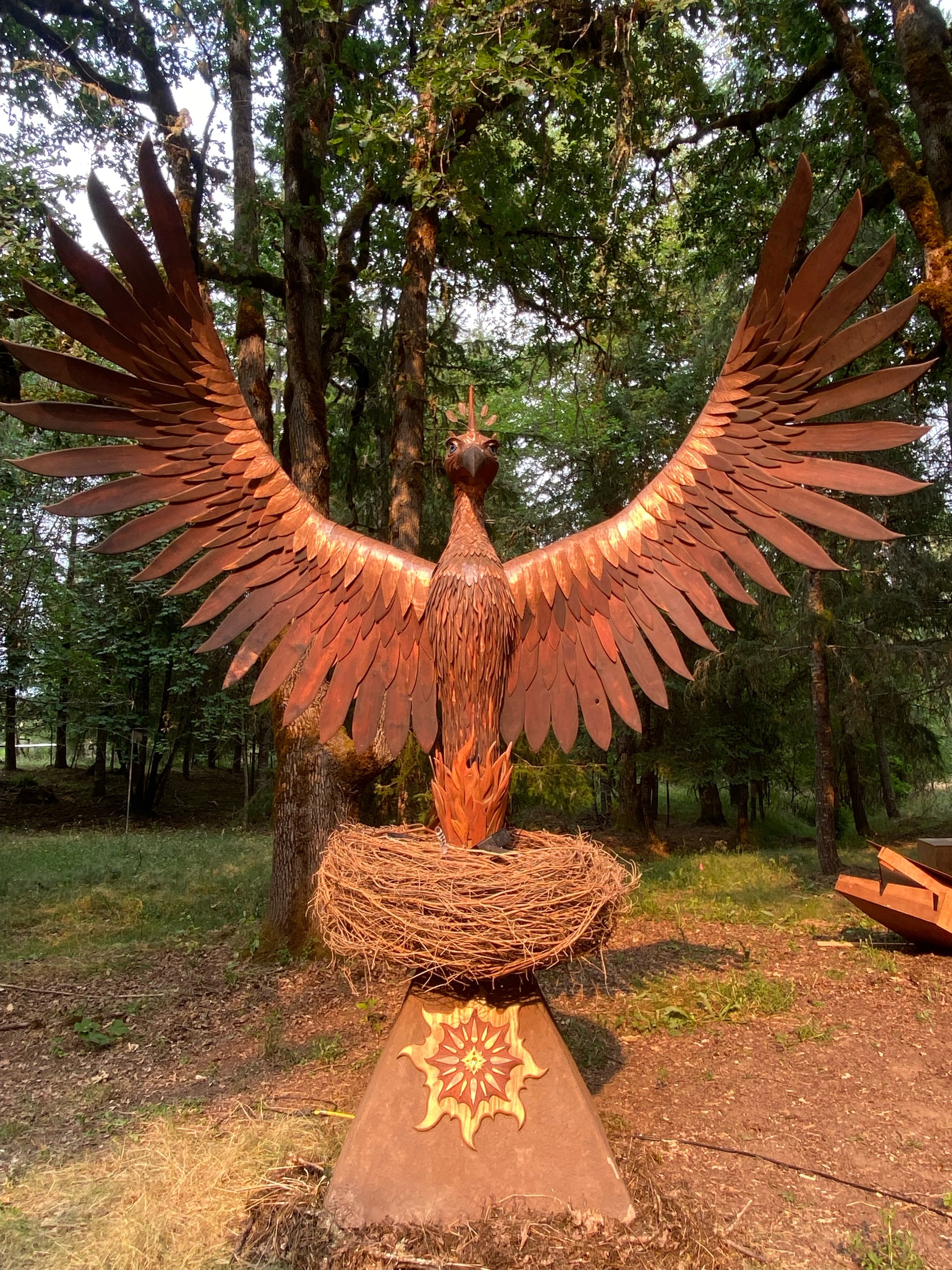 Fotia’s head is hand crafted from redwood, the eyes are blown glass with copper adornments, the countless feathers are individually carved from cedar and copper, her bones are made of steel, the nest is hand woven vine maple and the base is made of wood, steel and concrete.